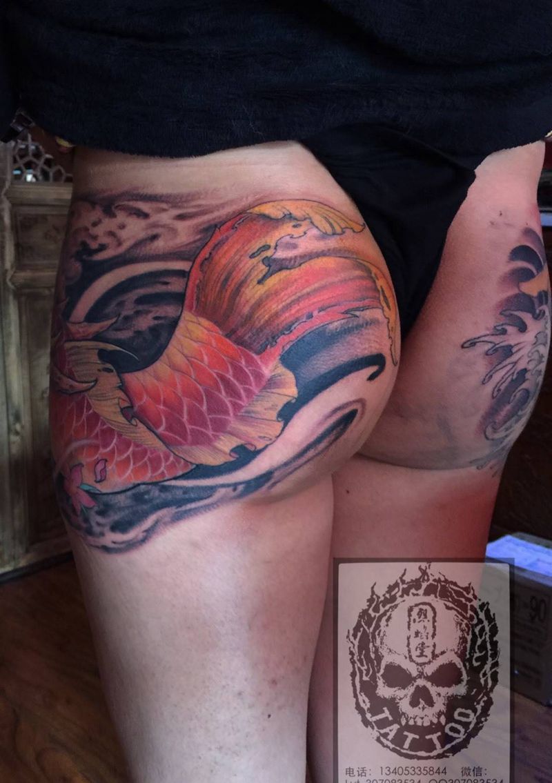 浩师傅作品鲤鱼纹身图片_成品腿部传统神兽动物原创纹身图案