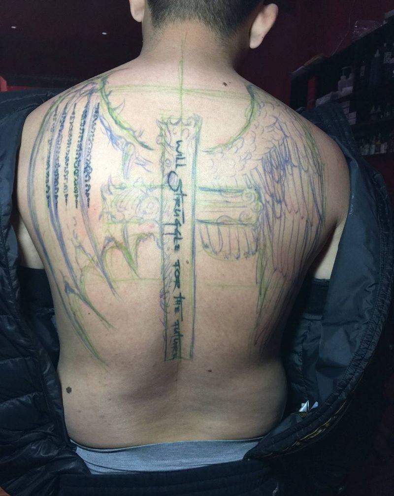 当前位置: 首页 >山东省淄博市纹身店-烈焰堂纹身纹身图案>天使与恶魔纹身图片_成品背部欧美原创遮盖作品修改宗教纹身图案