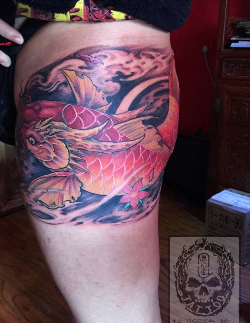 招财龙鲤纹身图片_成品腿部传统动物原创神兽纹身图案