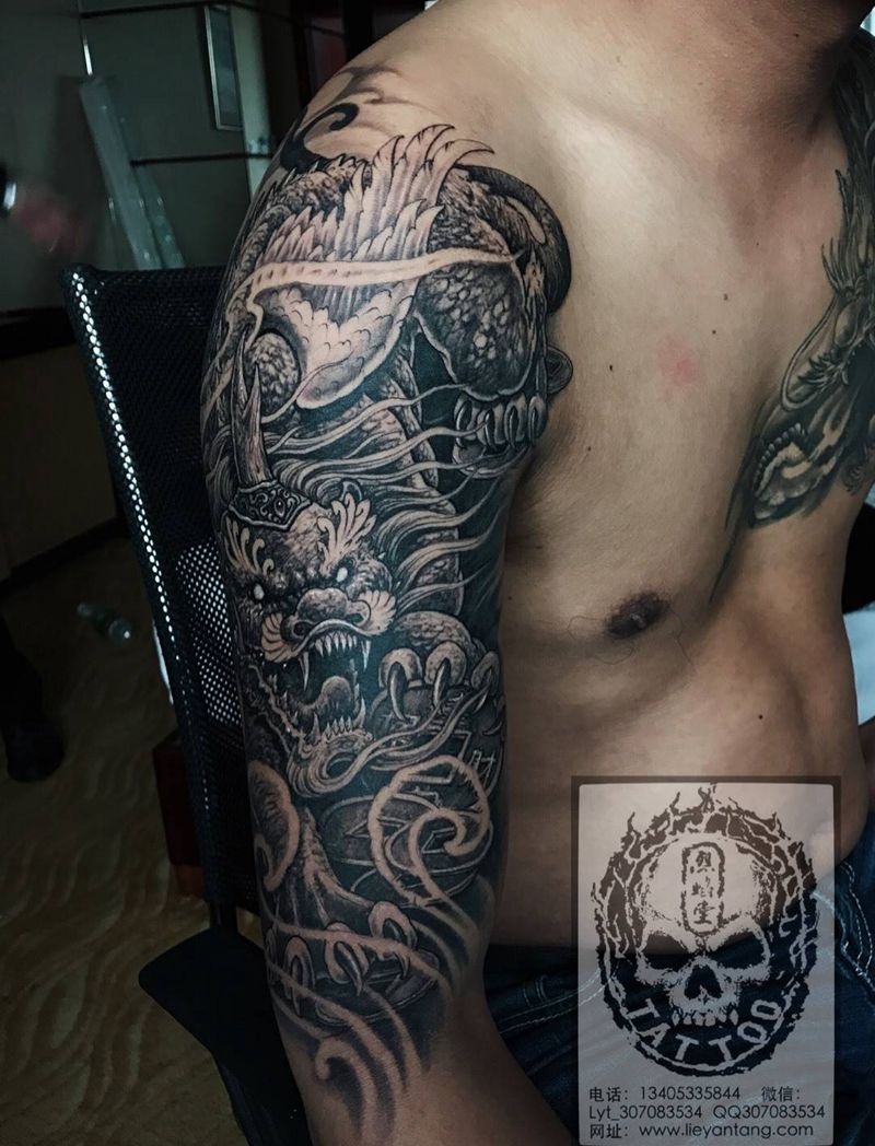 上臂貔貅纹身图片_成品肩部传统原创神兽纹身图案