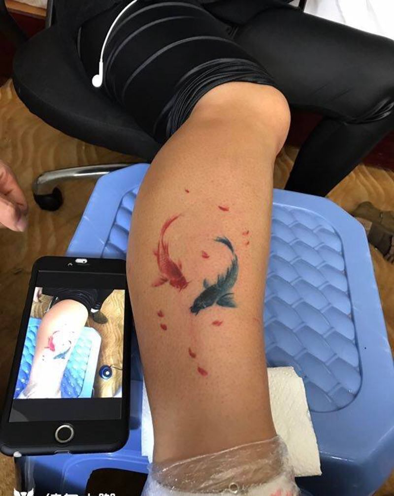 凤凰遮盖小鱼纹身图片_成品腿部传统动物遮盖作品修改纹身图案