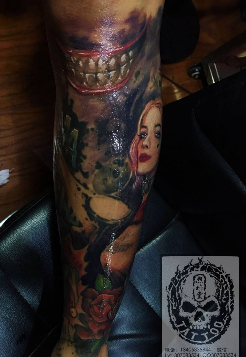 • T包小腿吹火男+阿多福纹身图片_腿部老传统新传统吹火男阿