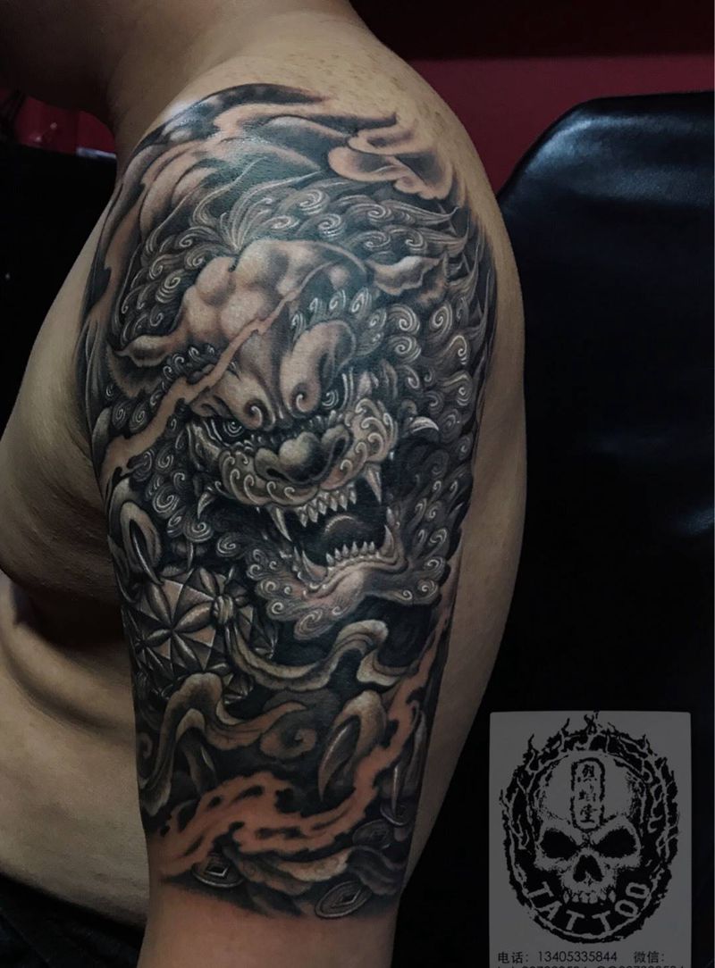 当前位置: 首页 >山东省淄博市纹身店-烈焰堂纹身纹身图案>唐狮纹身图片_成品手臂传统动物神兽纹身图案