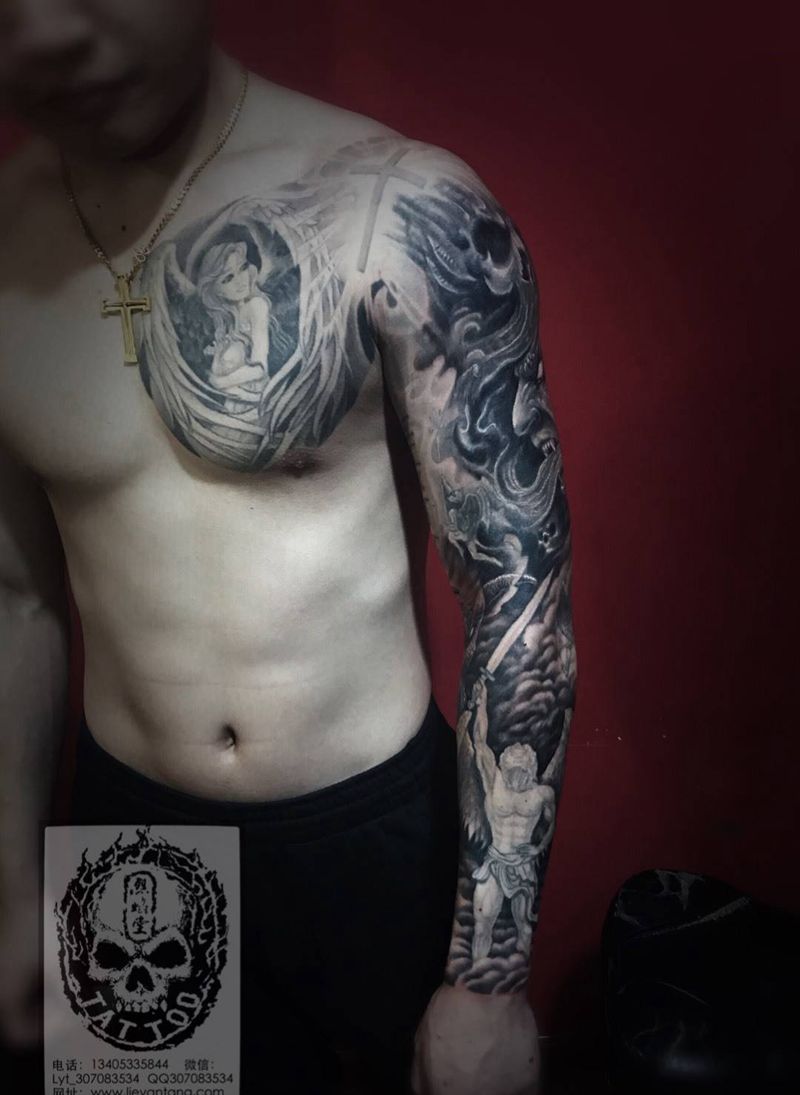 半甲花臂纹身图片_成品胸部手臂欧美人物鬼神纹身图案