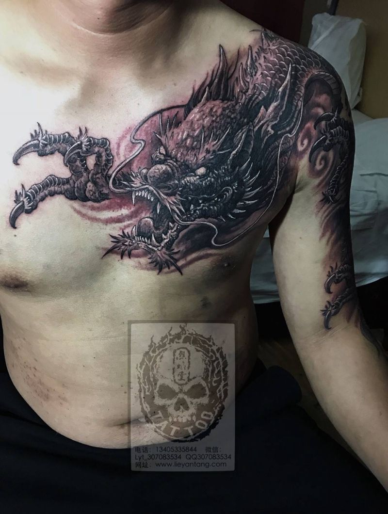 过肩龙纹身图片_成品肩部胸部传统神兽纹身图案
