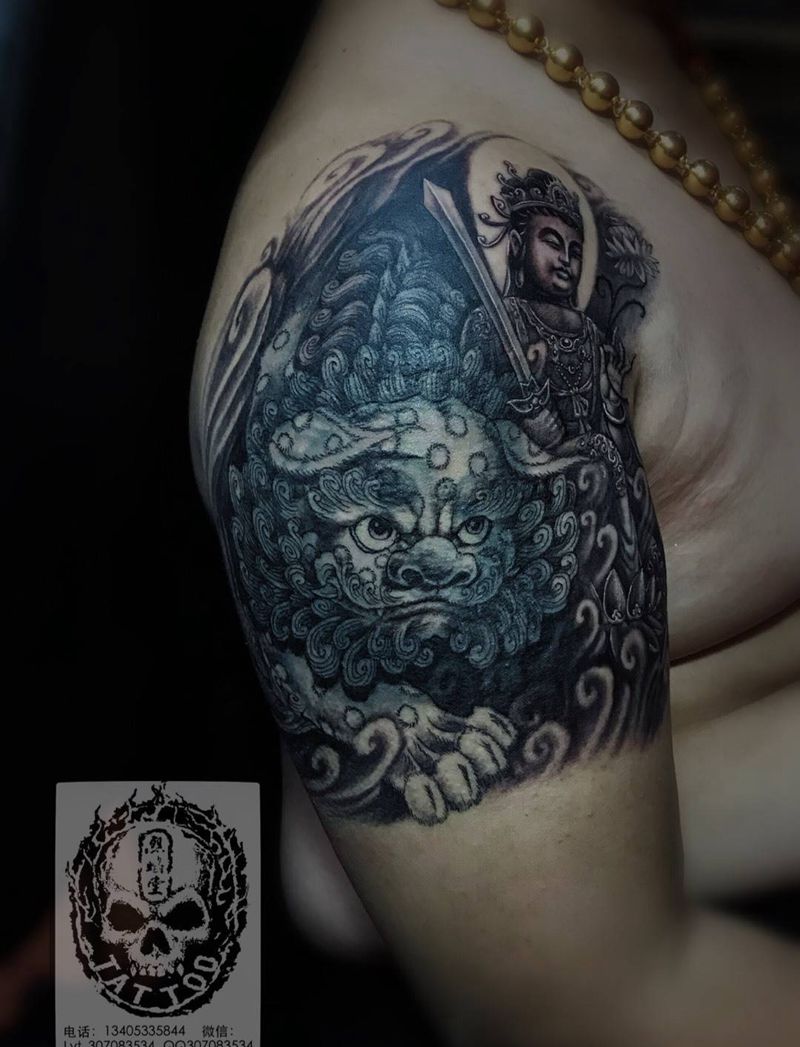文殊菩萨 萌狮子纹身图片_成品臀部传统神兽遮盖作品原创人物宗教动物纹身图案