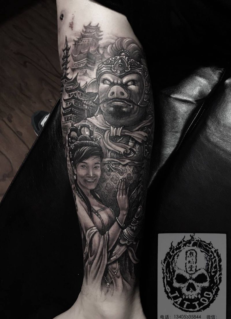 当前位置: 首页 >山东省淄博市纹身店-烈焰堂纹身纹身图案>家庭生效纹身纹身图片_成品腿部传统肖像原创神兽人物纹身图案