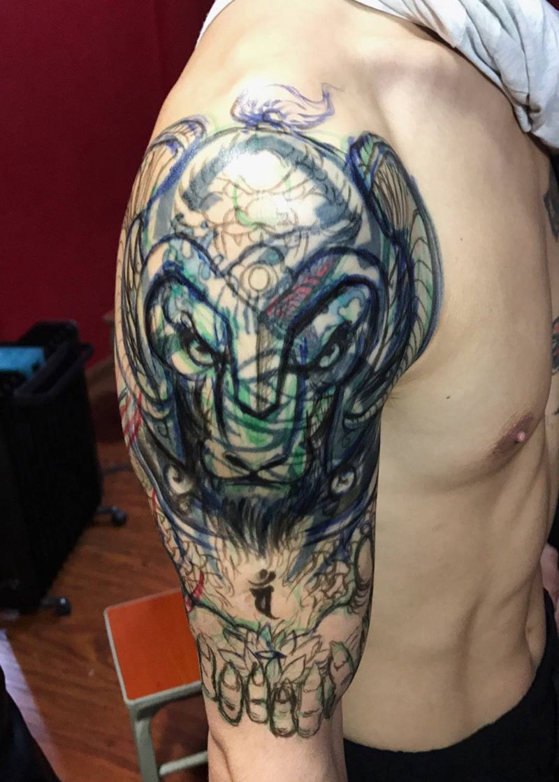 当前位置: 首页 >山东省淄博市纹身店-烈焰堂纹身纹身图案>暴力遮盖 羊武士纹身图片_成品遮盖作品传统肩部原创纹身图案