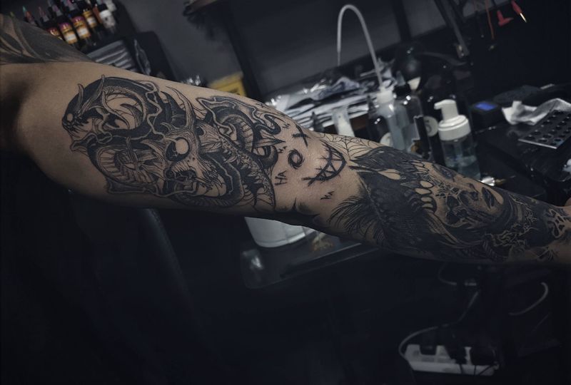 当前位置: 首页 >山东省淄博市纹身店-匠魂刺青纹身图案>暗黑风拼接纹身图片_手臂暗黑风纹身图案