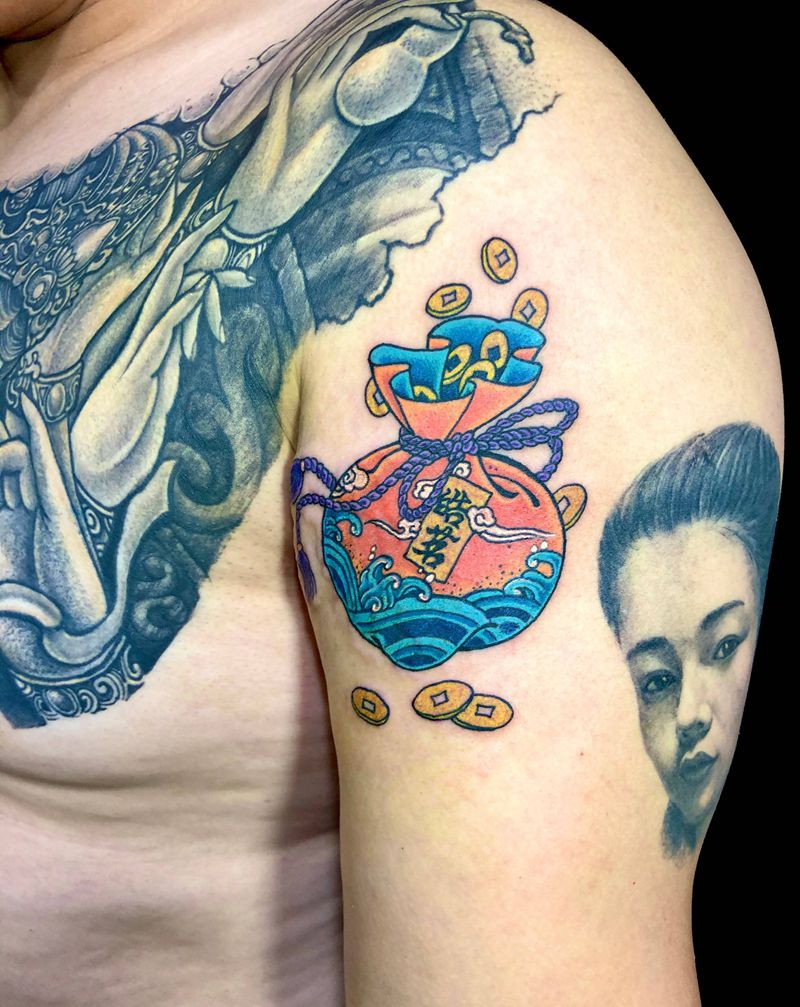 当前位置: 首页 >山东省淄博市纹身店-金艺堂纹身纹身图案>福袋纹身图片_手臂肩部新传统福袋大臂纹身图案