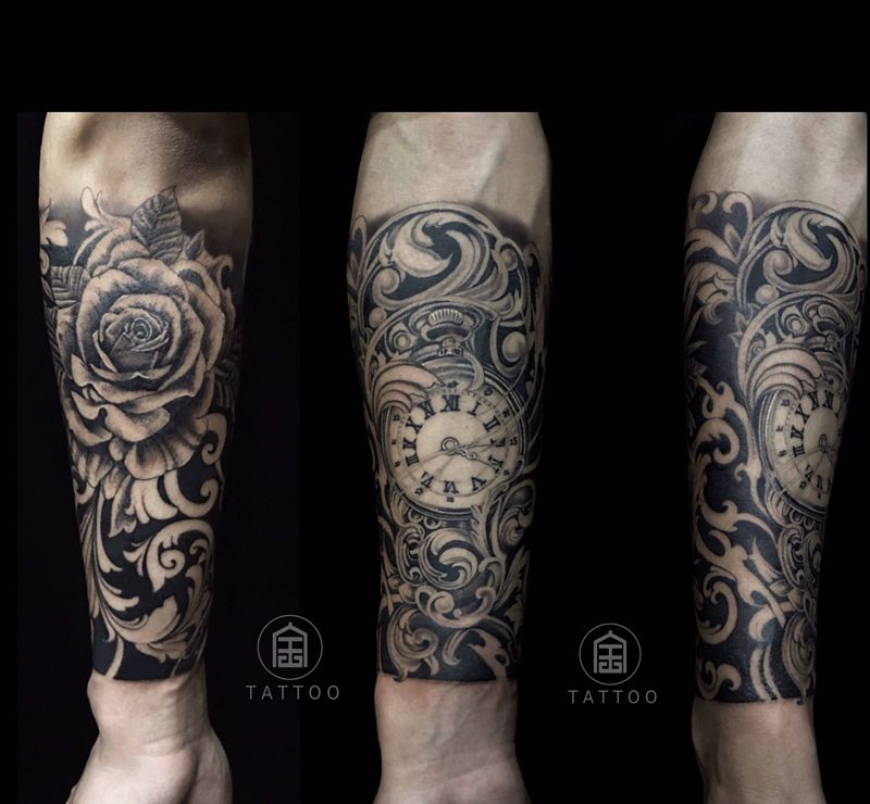当前位置: 首页 >山东省淄博市纹身店-金艺堂纹身纹身图案>钟表玫瑰花纹身图片_手臂手部欧美写实新传统玫瑰花钟表纹身图案