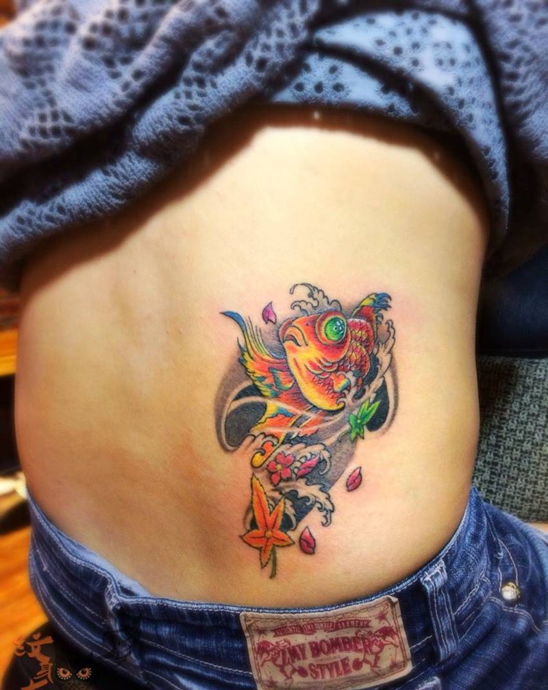 当前位置: 首页 >山东省淄博市纹身店-金艺堂纹身纹身图案>金鱼纹身图片_成品腰部传统动物鱼纹身图案