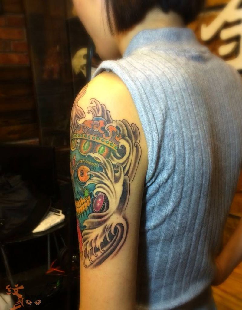 当前位置: 首页 >山东省淄博市纹身店-金艺堂纹身纹身图案>彩色嘎巴拉纹身图片_成品肩部传统宗教鬼神大臂纹身图案