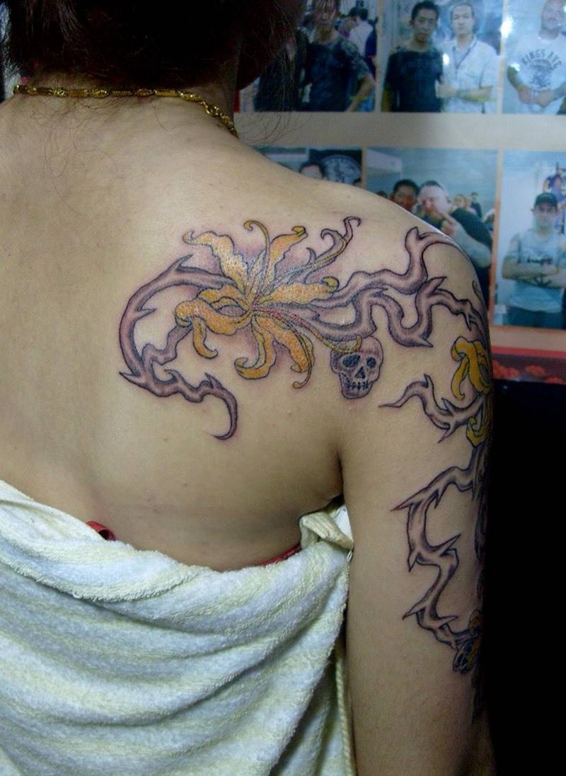 彼岸花纹身图片_成品肩部传统植物宗教大臂纹身图案