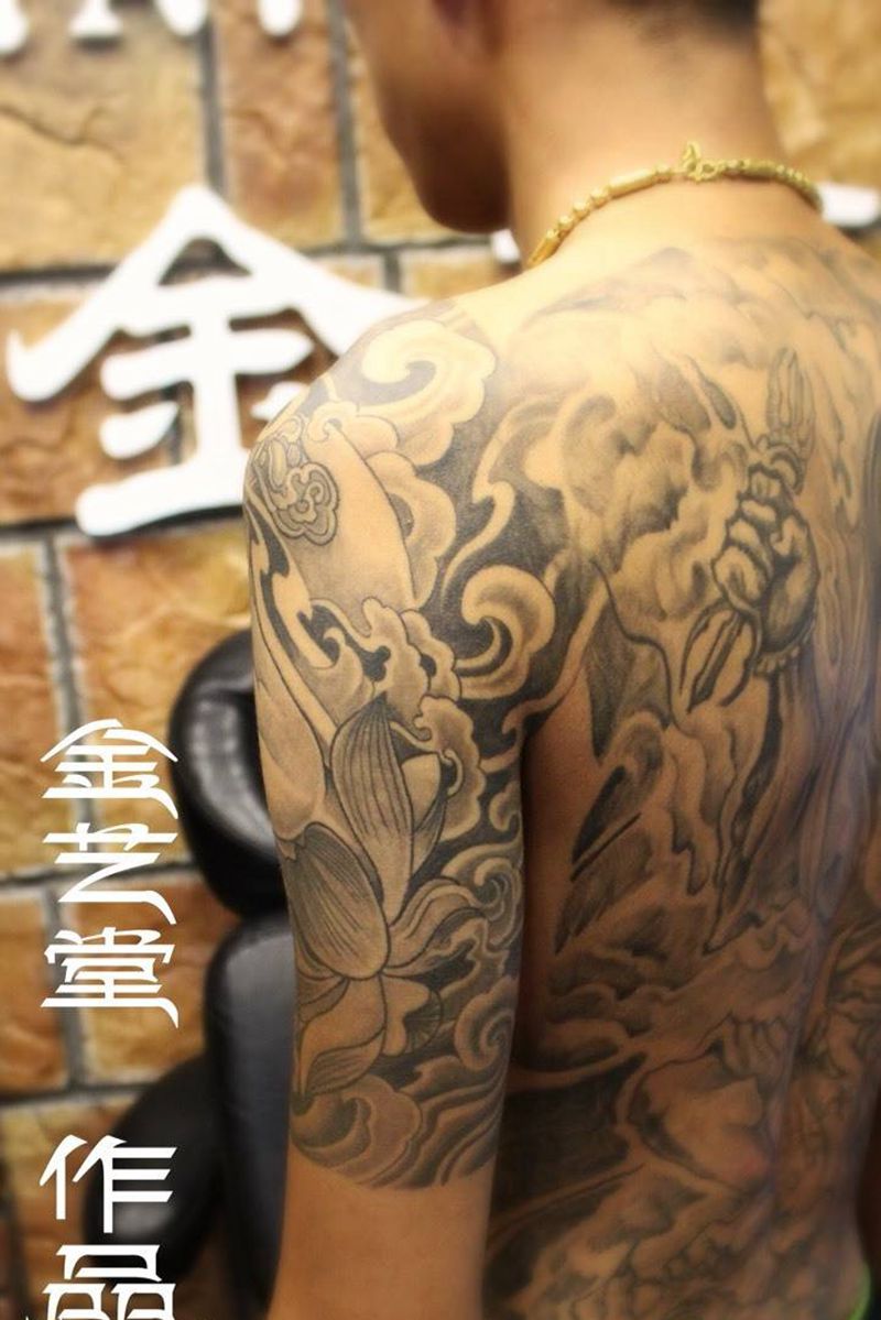 当前位置: 首页 >山东省淄博市纹身店-金艺堂纹身纹身图案>福狮佛手莲花纹身图片_成品胸部肩部手臂传统宗教半胛纹身图案