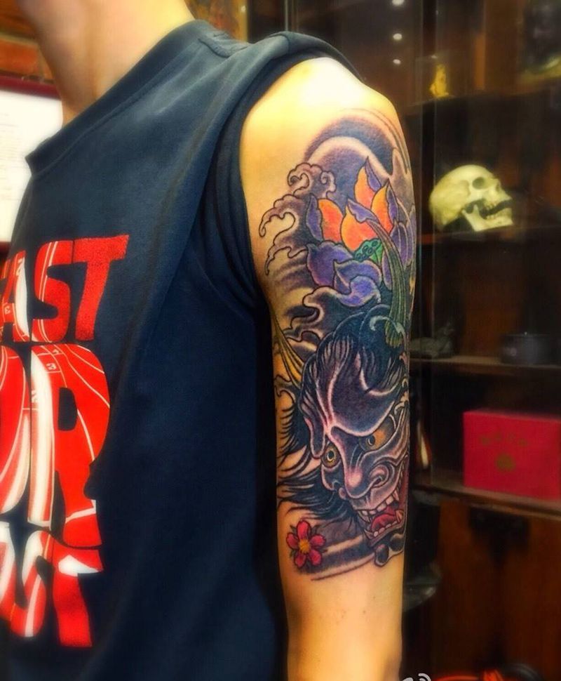 般若莲花纹身图片_成品手臂传统大臂遮盖鬼神纹身图案