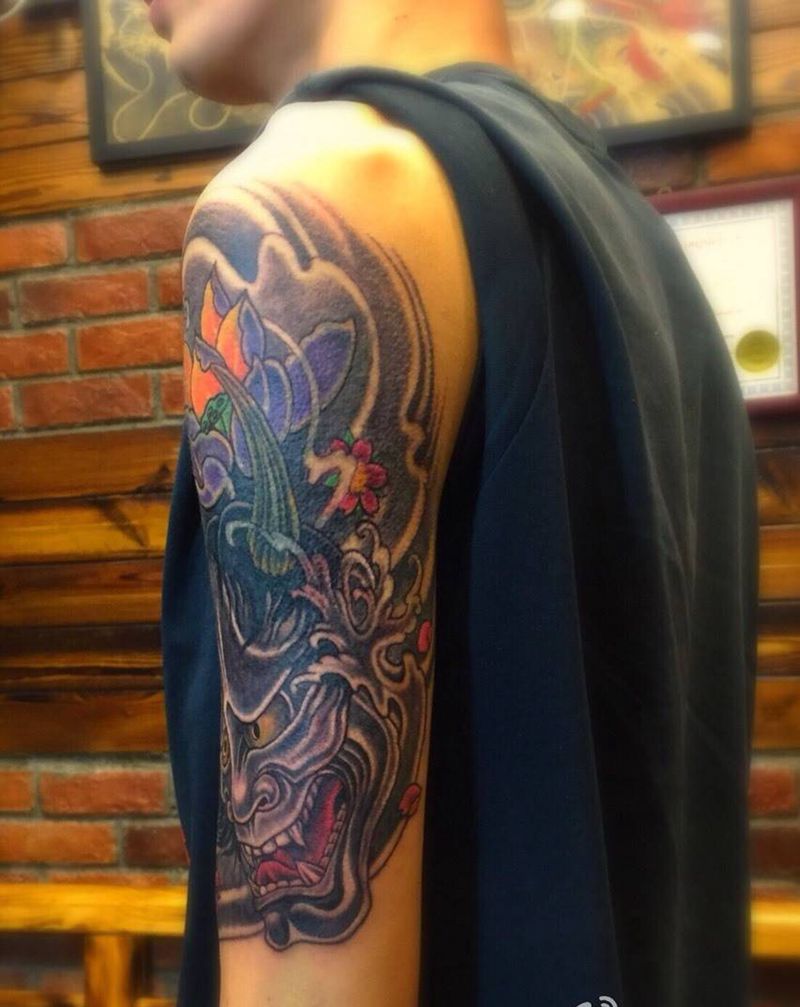 当前位置: 首页 >山东省淄博市纹身店-金艺堂纹身纹身图案>般若莲花纹身图片_成品手臂传统大臂遮盖鬼神纹身图案