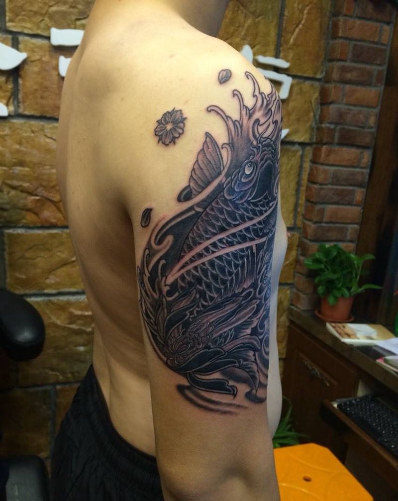 当前位置: 首页 >山东省淄博市纹身店-金艺堂纹身纹身图案>大臂鲤鱼纹身图片_成品手臂传统鲤鱼动物纹身图案
