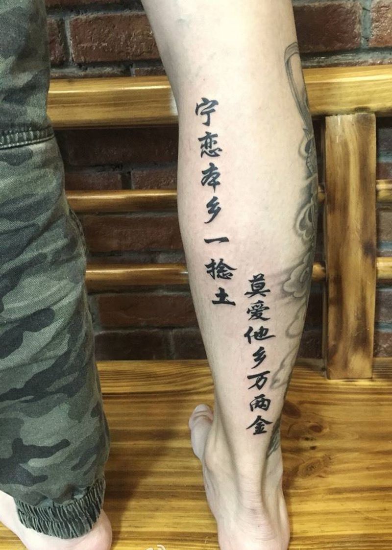 书法作品纹身图片_成品腿部字符原创纹身图案