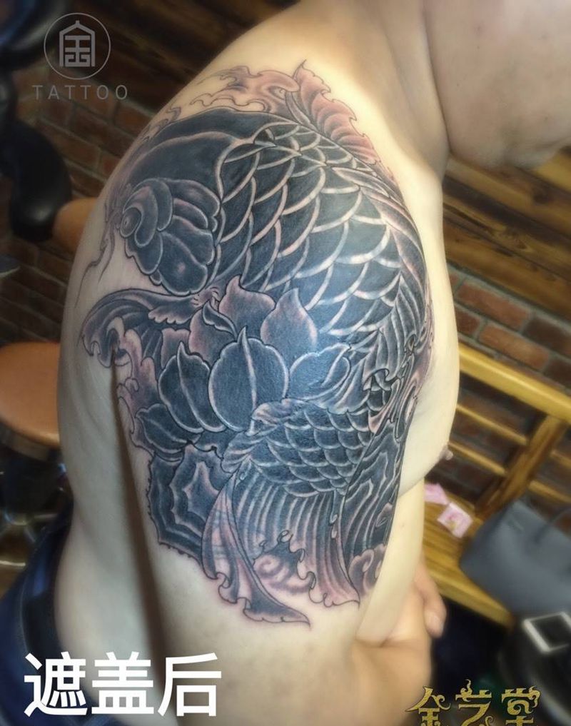 暴力遮盖纹身图片_成品肩部手臂传统鲤鱼遮盖大臂纹身图案