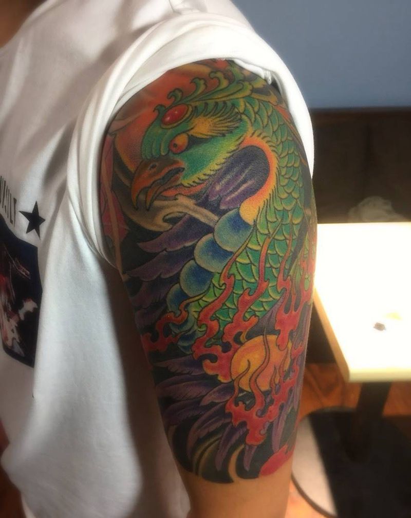 当前位置: 首页 >山东省淄博市纹身店-金艺堂纹身纹身图案>朱雀纹身图片_成品手臂传统动物大臂纹身图案