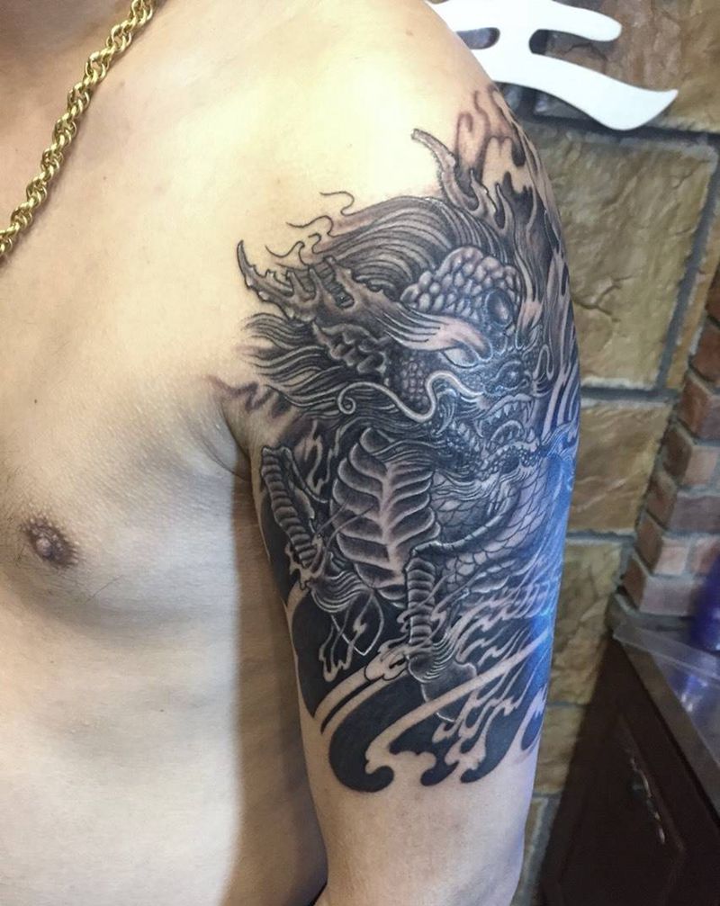 当前位置: 首页 >山东省淄博市纹身店-金艺堂纹身纹身图案>招财麒麟纹身图片_成品手臂传统大臂原创习俗纹身图案