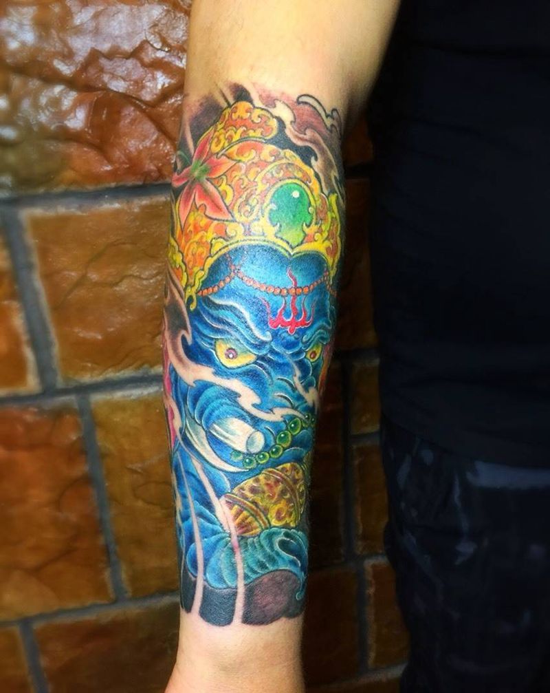 当前位置: 首页 >山东省淄博市纹身店-金艺堂纹身纹身图案>象神牡丹纹身图片_成品手臂传统鬼神植物原创纹身图案