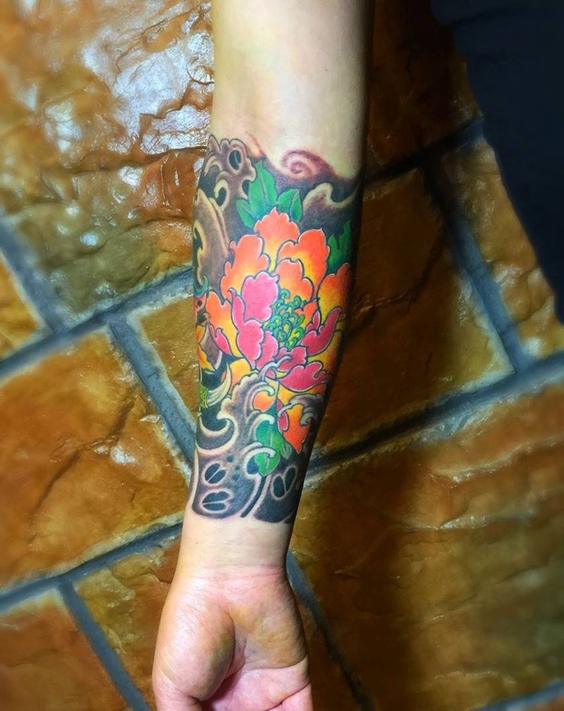 象神牡丹纹身图片_成品手臂传统鬼神植物原创纹身图案