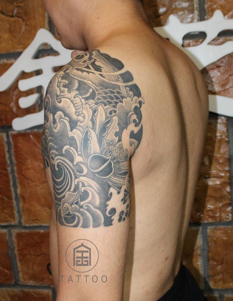 半甲鲤鱼(遮盖作品)纹身图片_成品胸部手臂传统鲤鱼遮盖大臂纹身图案