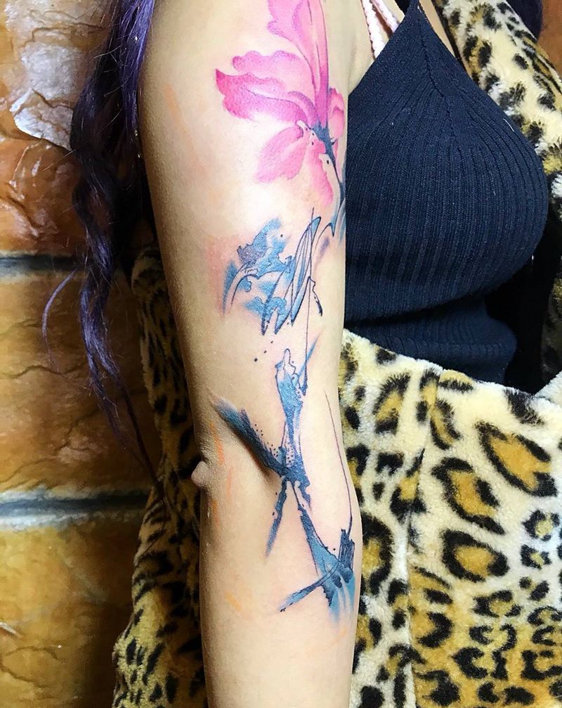 美女个性水彩风格花纹身图片_成品美女彩色清新手臂原创植物水彩风格纹身图案