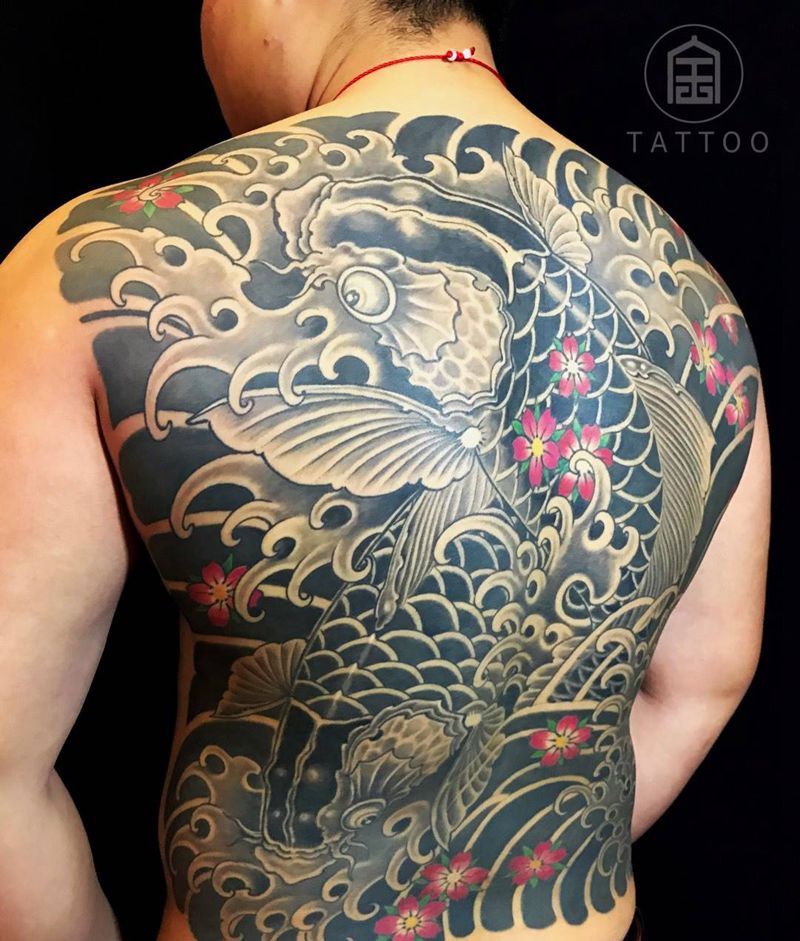 满背双鱼图纹身图片_背部新传统鲤鱼满背纹身图案