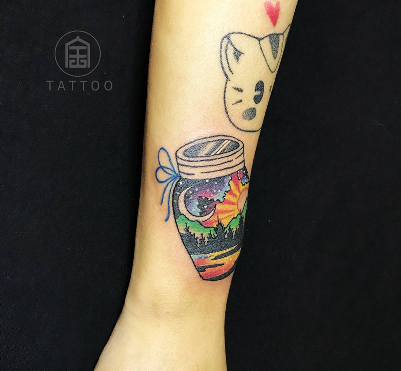 一个有梦想的罐子纹身图片_手臂New School水彩纹身图案