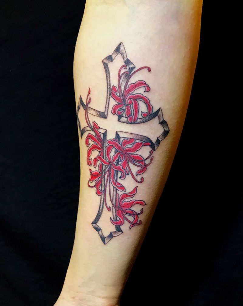 当前位置: 首页 >山东省淄博市纹身店-金艺堂纹身纹身图案>十字架纹身图片_手臂新传统纹身图案