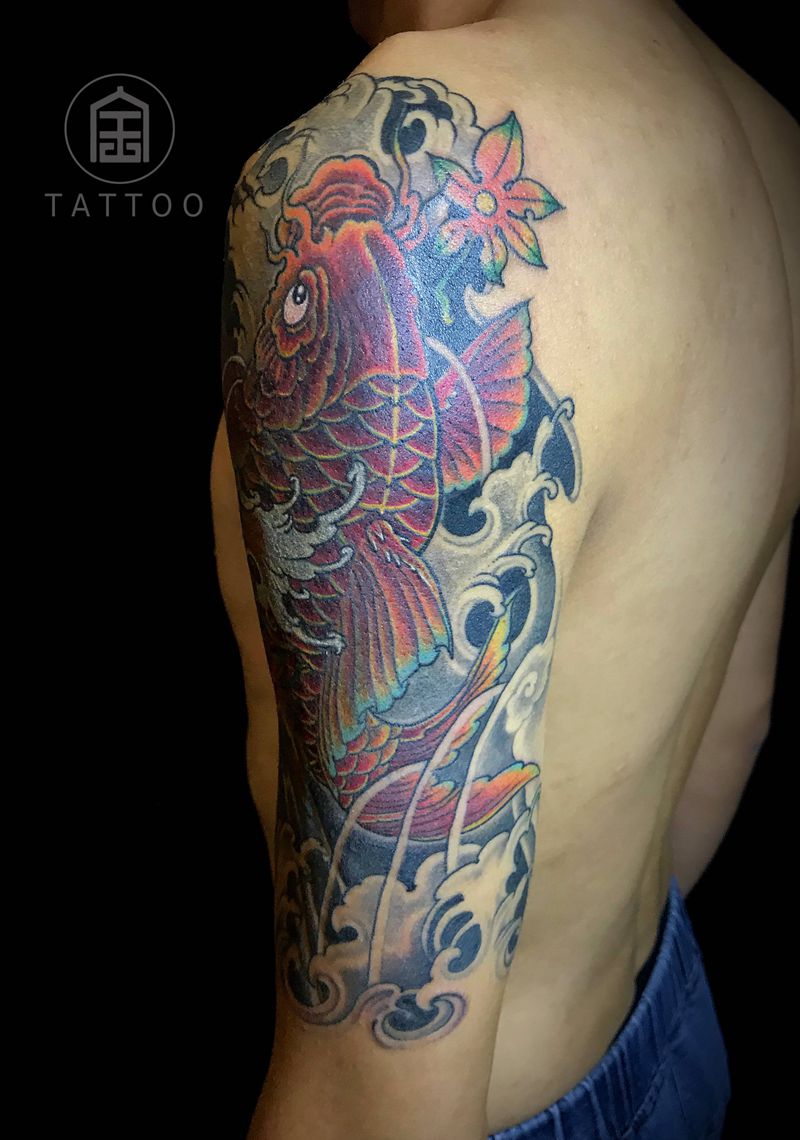 鲤鱼(遮盖)纹身图片_手臂新传统鲤鱼遮盖暴力遮盖纹身图案