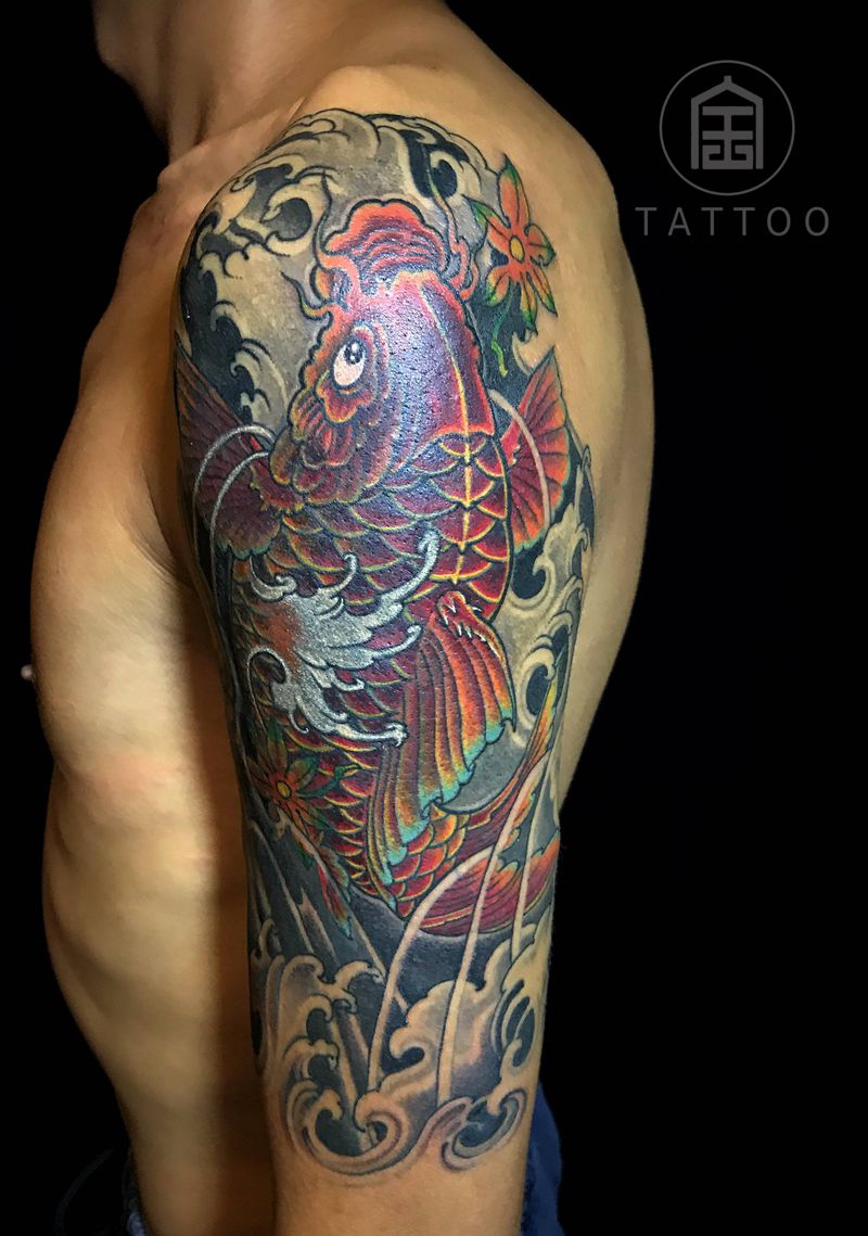 鲤鱼(遮盖)纹身图片_手臂新传统鲤鱼遮盖暴力遮盖纹身图案