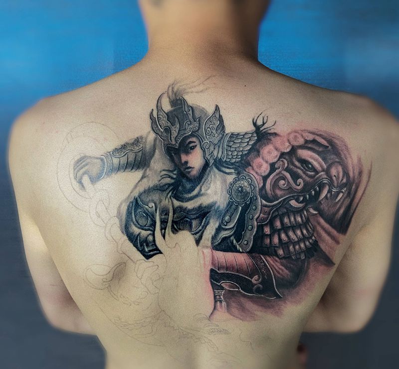 龙临未完纹身图片_背部新传统欧美写实纹身图案