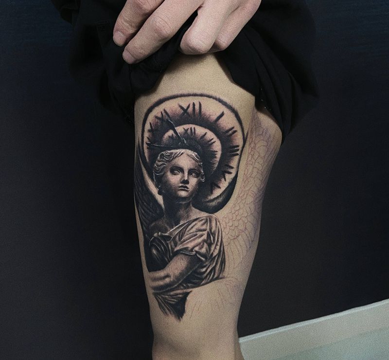 天使雕塑纹身图片_腿部欧美写实天使雕塑纹身图案