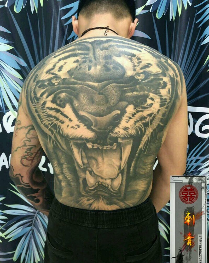 虎威纹身图片_背部新传统欧美写实虎纹身图案