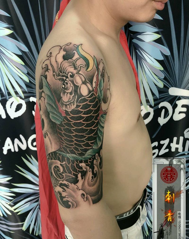 当前位置: 首页 >山东省枣庄市纹身店-囍刺青纹身图案>鱼遮盖图腾纹身图片_手臂肩部新传统老传统纹身图案