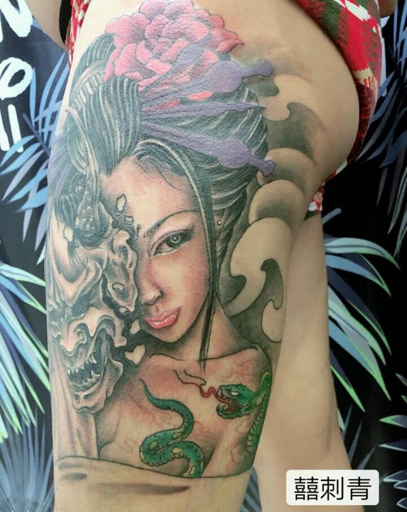 艺妓班诺纹身图片_腿部新传统艺妓般诺纹身图案