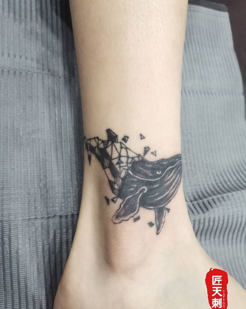 鲸鱼 遮盖纹身图片_脚部腿部几何水墨纹身图案