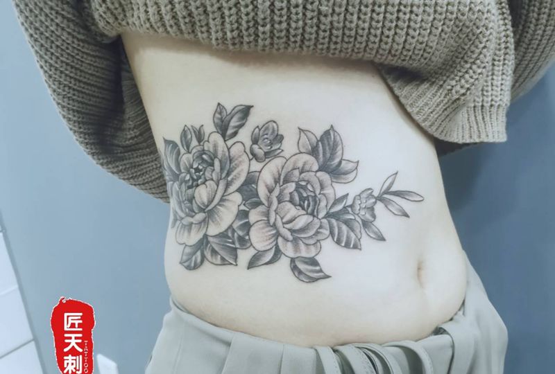 清新素花纹身图片_腰部腹部点刺水墨素花纹身图案