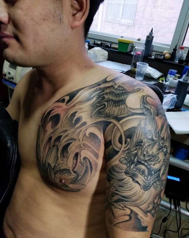 当前位置: 首页 >山东省枣庄市纹身店-滕州刺绣堂纹身纹身图案>唐狮包甲纹身图片