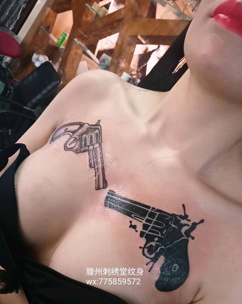 当前位置: 首页 >山东省枣庄市纹身店-滕州刺绣堂纹身纹身图案>双枪纹身图片_胸部纹身图案