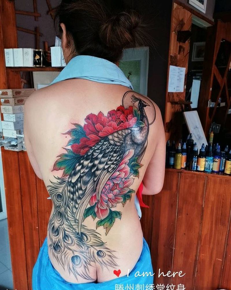 孔雀牡丹图纹身图片_背部新传统纹身图案