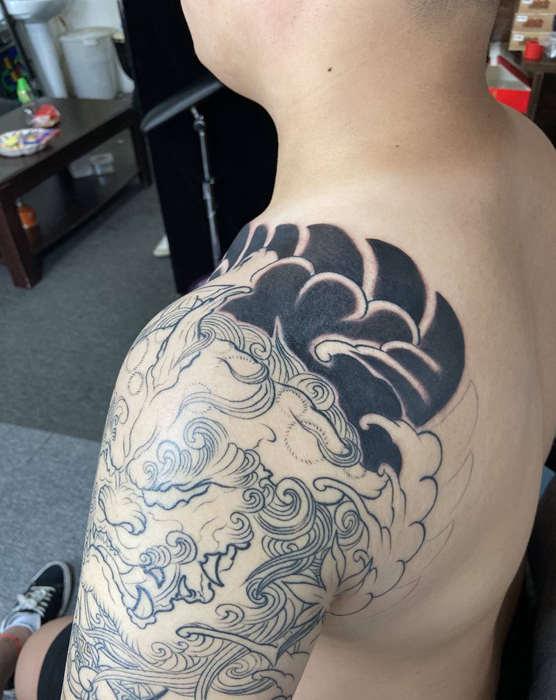 当前位置: 首页 >山东省烟台市纹身店-黎印刺青纹身图案>半胛牡丹唐狮纹身图片_手臂胸部老传统纹身图案