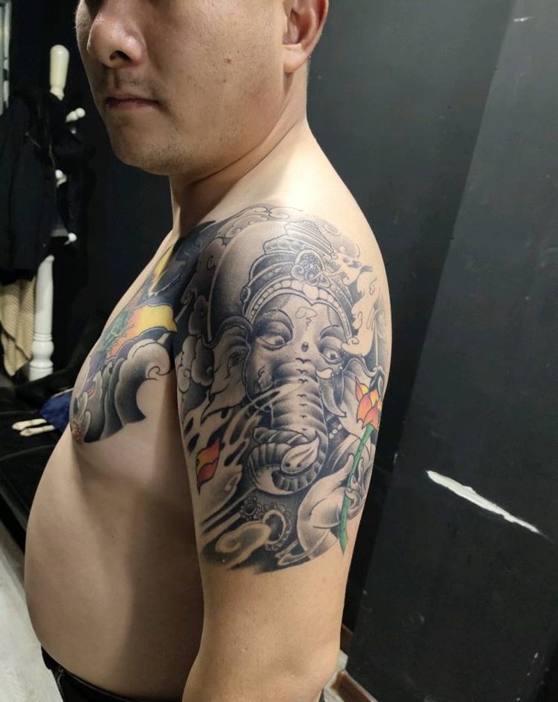 半甲荷花象神纹身图片_胸部手臂新传统荷花象神纹身图案