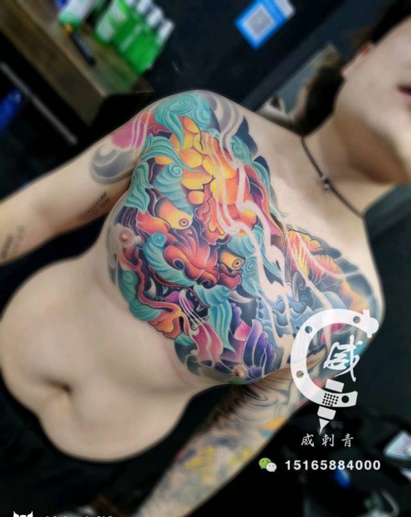 当前位置: 首页 >山东省枣庄市纹身店-威刺青纹身图案>前胸唐狮纹身图片_胸部新传统唐狮纹身图案