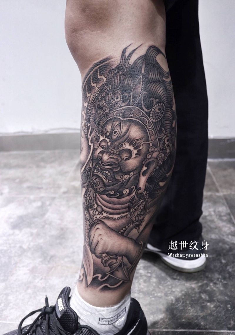 大黑天纹身图片_腿部新传统纹身图案