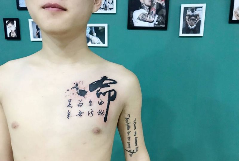 毛笔字合集纹身图片_胸部水墨成品传统原创纹身图案